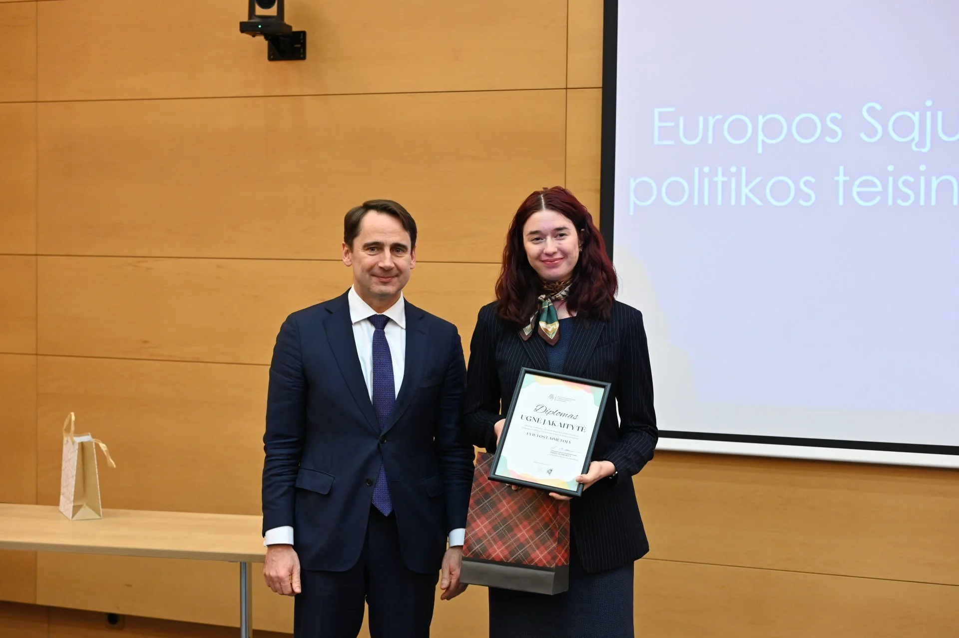1 vieta — Ugnė Jakaitytė (VU) „Europos Sąjungos bendros užsienio ir saugumo politikos teisinio reglamentavimo ir įgyvendinimo iššūkiai“. Darbe analizuojama, kokios teisinės ribos ir struktūriniai neapibrėžtumai trukdo efektyviai įgyvendinti ES bendrą užsienio ir saugumo politiką. Baigiamojo darbo vadovė – Deimilė Prapiestytė.